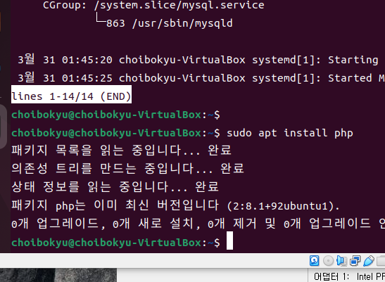 PHP를 설치하기 위해 위 코드를 입력해준다. 뒤의 코드들까지 입력하면 apache2와 mysql을 php와 연동할 수 있게 해준다. 근데 난 mysql 연동 안되던데 뭐가 문제지...