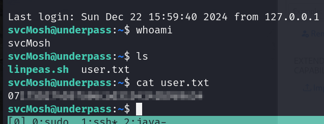 whoami를 찍어보니 svcMosh로 잘 로그인되었고 user.txt를 읽어 플래그를 획득했다.