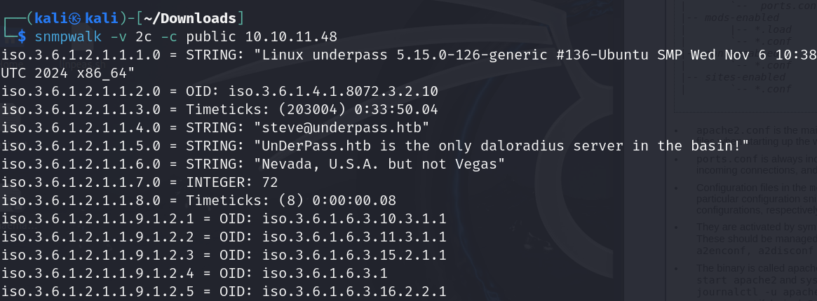 그리고 snmp 포트가 열려있을 때 사용가능한 snmpwalk 를 사용 시 steve라는 계정과 daloradius라는 서버가 돌아가고 있는 것을 확인할 수 있다.
