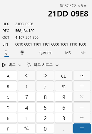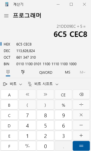프로그래머 계산기로 0x21DD09EC를 5로 나눠주니 6C5CEC8이었다.