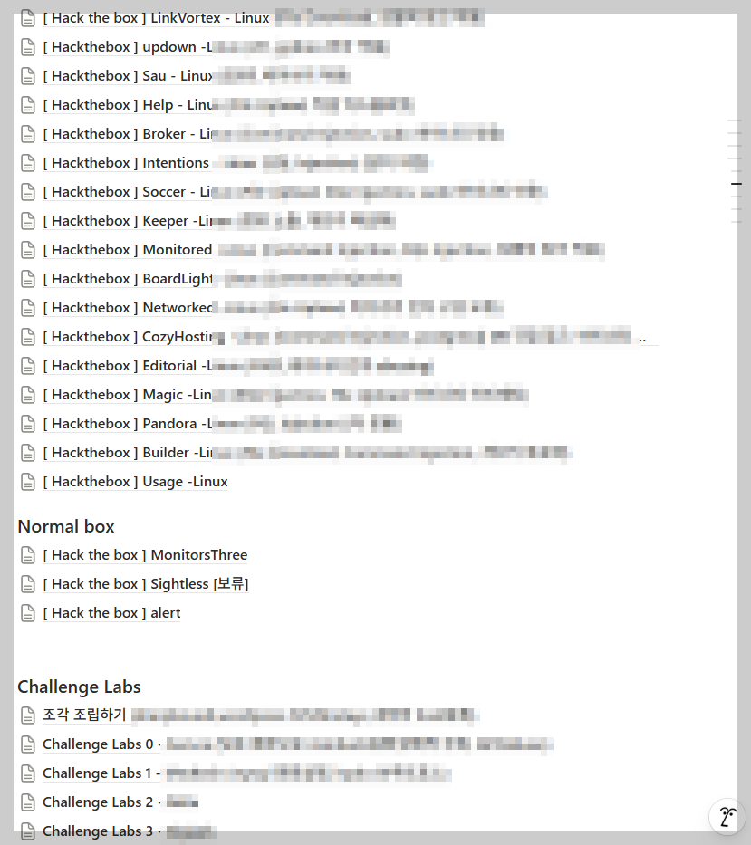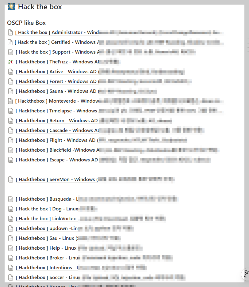 이 때까지 풀었던 박스들이다. 후기를 적으며 몇개 풀었는지 세보니까 티스토리에 작성했던 writeup까지 포함해서 100개 넘게 풀었다. 모자이크 된 부분은 해당 박스의 주요 공격 체인 아이디어여서 모자이크한 것이다. 필자는 Vulnhub이나 Tryhackme를 풀지는 않았다. 관성이 심한 성격이라 Hack the box랑 PEN-200에서 제공하는 챌린지 랩만 해치워가기에도 벅찼고, 그리고 3개월 수강기간이 끝난 이후에는 Proving Grounds를 한달씩 결제해가며 공부를 이어나갔다. Offsec이 만든 시험인데 Offsec이 제공하는 문제를 풀어야지! 하는 마음이었다.