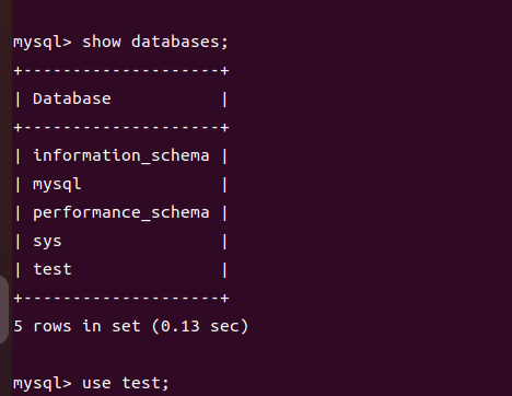 mysql에서 test라는 database를 다시 새로 하나 만들었다.