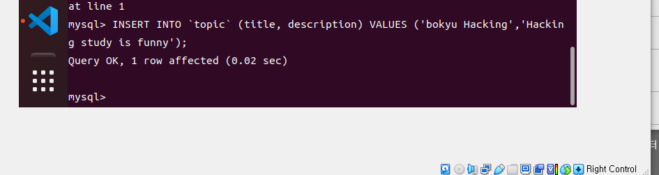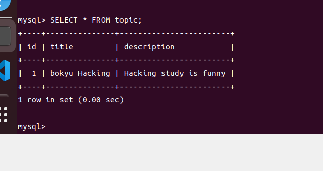 그렇게 명령어를 다 입력한 후, SELECT * FROM topic;으로 확인해보니