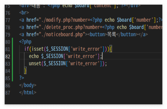 세션함수를 활용하여 $_SESSION['write_error'] 변수가 존재하면 echo로 해당 메시지를 출력하고,