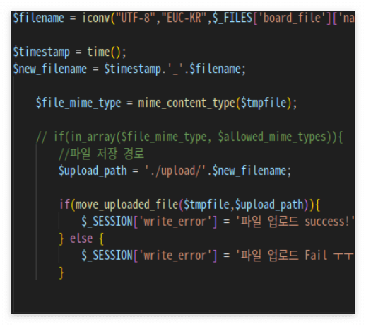 저장위치는 해당 웹 서버에 upload 폴더를 만들어 new_filename 변수 이름으로 저장됩니다.