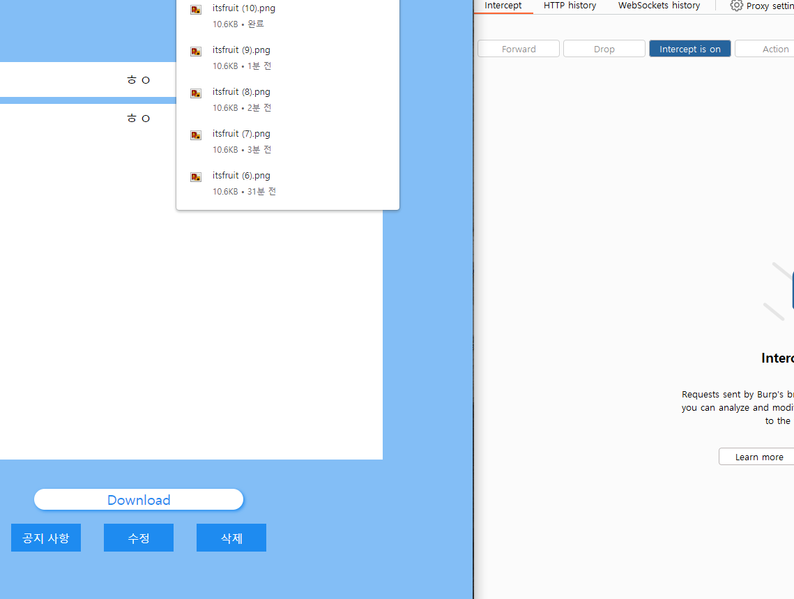 이상한 건 intercept 를 on 하고 Download를 눌렀는데도 다운로드가 받아졌다는 것입니다.