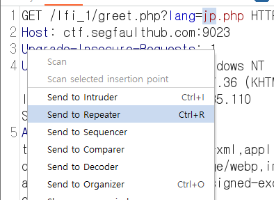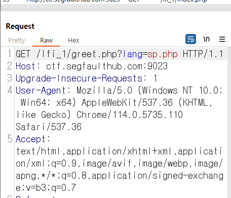Burp Suite로 파라미터를 보니 lang 파라미터로 sp.php를 받고 있습니다.