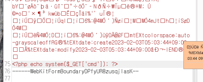 그래서 png 파일을 업로드할 때 intercept로 패킷을 잡고 PNG 파일 시그니쳐 밑에 한 줄 웹 쉘 코드를 입력했습니다.